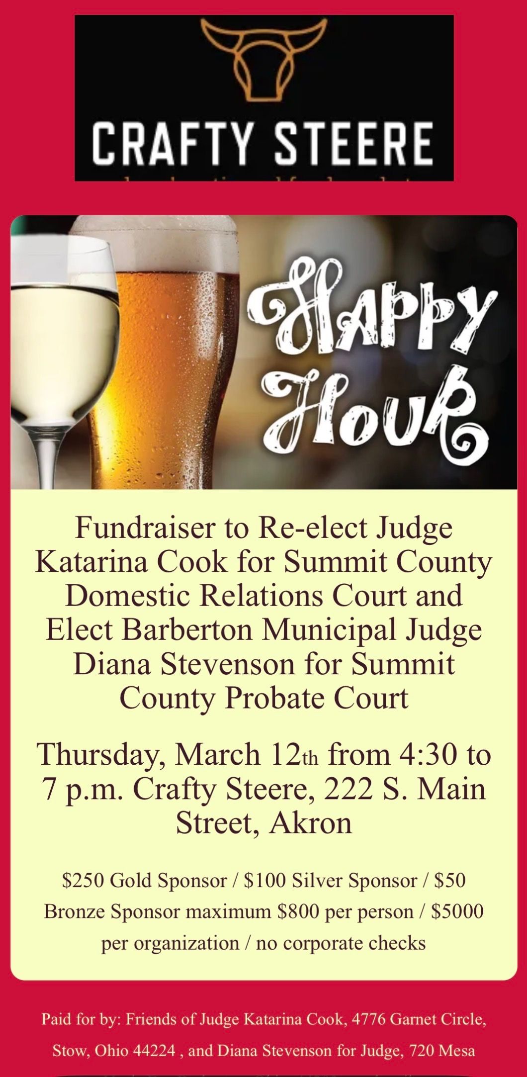 Fundraiser to Re-elect Judge Katarina Cook for Summit County Domestic Relations Court and Elect Barberton Municipal Judge Diana Stevenson for Summit County Probate Court